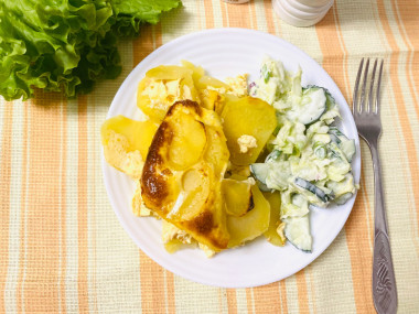Калорийность продуктов: Картошка, Сливки жирные, Яйца, Соль, Перец черный молотый, Твёрдый сыр, Растительное масло, Пшеничная мука