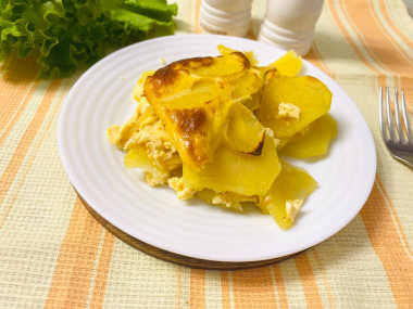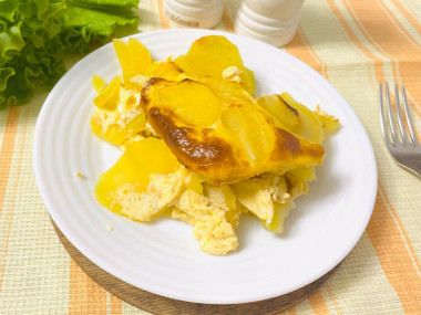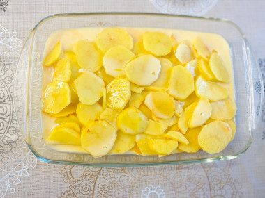 Залейте картофель получившейся яичной массой. Немного потрясите форму, чтобы заливка равномерно распределилась.