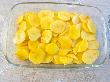 Уложите в форму кружочки картофеля ровным слоем.
