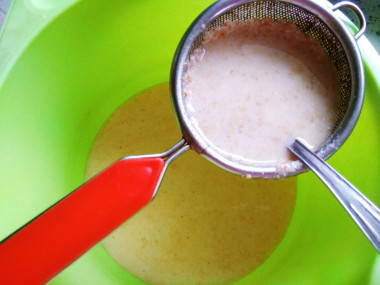 Теперь смесь процедите. Чтобы было удобнее отфильтровать полученную жидкость, возьмите глубокую миску или кастрюльку, на нее установите сито, на которое положите несколько слоев марли (2-3). Вылейте овсяную массу в сито и оставьте ее стекать. Можете немного помочь ложкой.