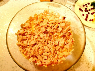 Этот салат с гранатом и курицей и орехами я собирала вечером, чтобы за ночь все слои "подружились") Мне нравится такое сочетание продуктов, тем более куриная грудка не только вкусная, но и полезная и с ней много чего хорошо сочетается. Я выкладывала слои не горкой на тарелку, а в глубокий салатник, чтобы можно было верх затянуть пищевой пленкой на ночь. Количество продуктов увеличила в полтора раза и повторила каждый слой по два раза. За ночь салат отлично пропитался, стал нежным и мягким. Он легкий, но при этом достаточно сытный. Мне очень понравился вкус, в салате нет ничего острого, наоборот отварная морковь и кукуруза дают сладковатый привкус. Жареные грецкие решки добавляют пикантности и терпкого аромата) Салат смотрится красиво, празднично, всем гостям понравился. Очень вкусно!