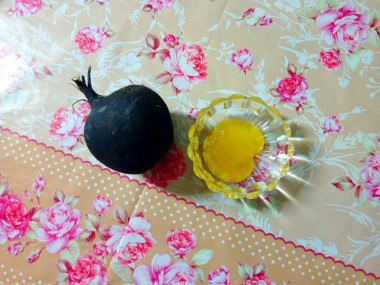 Вариант 1: традиционный. Понадобится редька, острый нож, мед и емкость, чтобы поместить редьку. Емкость должна прилегать к корнеплоду не слишком плотно. Редьку нужно очень хорошо отмыть от грязи губкой.