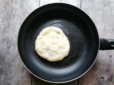Налейте в сковороду растительное масло и хорошо его разогрейте. Масло можно использовать оливковое или подсолнечное, главное, чтобы оно было рафинированным. Осторожно опускаем в кипящее масло одну лепешку. Жарим ее до румяности с одной стороны примерно 4 минуты.