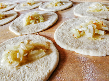 Начинки могут быть разные, например, с сыром, зеленым луком и вареным яйцом, предварительно обжаренными грибами или фаршем.