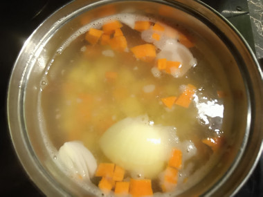 2. Вскипятите в кастрюле подсоленную воду, добавьте нарезанные овощи и целую луковицу и варите до готовности 15 минут. Затем луковицу выньте.