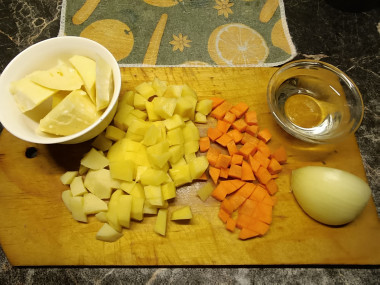 1. Картофель и морковь очистите, нарежьте небольшими кубиками. Лук очистите.
