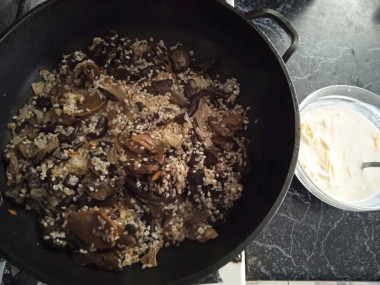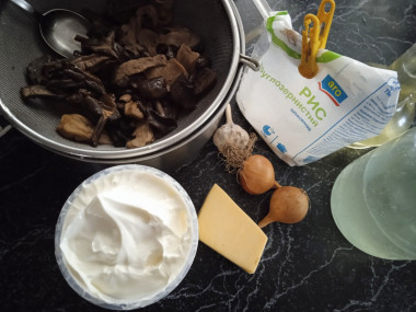 Понравился мне этот интересный рецепт, решила попробовать сделать ризотто с белыми грибами со сливками. Только сливки я заменила сметаной. Белые грибы у меня сушеные, я их отварила в подсоленной воде два раза. Куриный бульон использовала ранее приготовленный и замороженный. Делала всё чётко по рецепту. Обжарила лук, добавила круглый рис, потомила с белым вином. Положила чесночок и белые грибы. Тушила ризотто, постоянно доливая горячий куриный бульон. Из специй добавила лишь соль и перец. Готовила в общей сложности минут 25 до готовности риса. Смешала сметану с натёртым сыром (взяла голландский) и в конце добавила к рису с грибами.