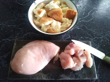 Ломтики белого хлеба подсушить на воздухе около 2-ух часов. Подсохший хлеб залить сливками и оставить на 15 минут. Размоченный хлеб хорошенько размять руками.