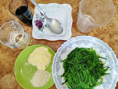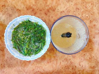 В водоросли влейте кунжутное масло, соевый соус, лимонный сок, воду, всыпьте крахмал и кунжут. Все тщательно перемешайте. Оставьте водоросли мариноваться, пока делаете ореховый соус.