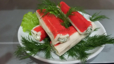 Небольшая хитрость- крабовые палочки хорошо раскручиваются только после того, как побывают в кипятке около 5 минут и станут мягкими. Без отпаривания вы их не сможете как следует развернуть - она будут рваться на местах сгибов. Доставайте палочки по одной и разворачивайте на доске. Выкладывайте начинку на внутренний край, используя чайную ложку, и скатывайте обратно, слегка приминая крабовое мясо к начинке. Крабовая палочка значительно вырастет вширь!