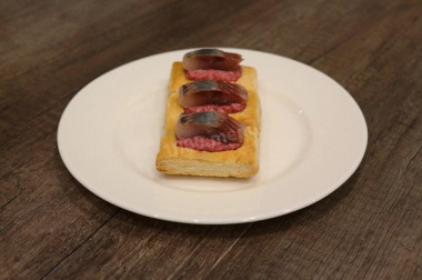 Тарталетки начинить «шубой», а сверху выложить по кусочку селедки, сверху выложить колечки лука. Финита! Приятного аппетита!