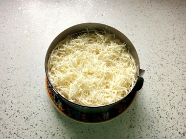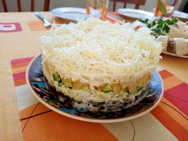 Последним слоем выложите сыр. Натрите его на мелкой или средней терке и равномерно распределите по всей поверхности салата. Уберите салат в холодильник на пару часов, чтобы он пропитался и охладился. Кстати с сыром можно экспериментировать и брать любой сыр на ваш вкус.