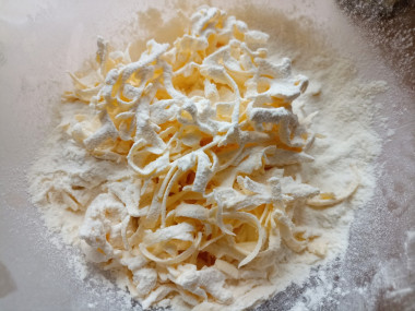 Муку просеять через сито, перемешать с солью и содой. Затем масло с мукой растереть в крошку - я делаю это с помощью блендера (беру сначала 2 стакана, затем подсыпаю остальную муку при замесе теста), так быстрее, но можно делать это руками - здесь кто как привык