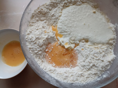 Пересыпаем ее в большую емкость, добавляем кефир и яйцо