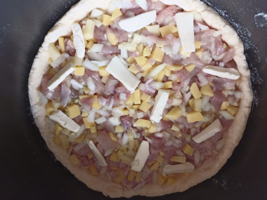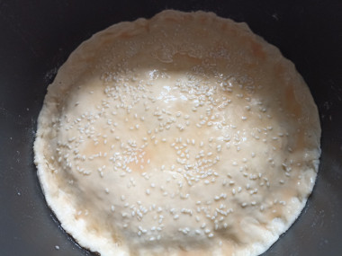 2/3 теста выкладываем в чашу мультиварки, формируем высокие бортики, протыкаем в нескольких местах вилкой