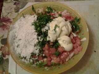 Затем положите немного майонеза. Благодаря майонезу котлеты получатся сочнее и нежнее. Вместо майонеза можете взять кефир или сметану. Для скрепления котлетной массы добавьте в фарш крахмал. Или муку, если нет крахмала. Положите немного измельченной зелени по вкусу. В качестве зелени можете использовать зеленый лук. Зелень предварительно помойте и обсушите.