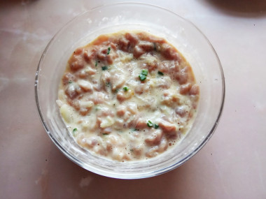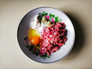 Мясной фарш немного подсолите (не забывайте о наличии майонеза, который уже содержит соль) и добавьте специи по вкусу. Всю массу хорошо перемешайте до однородного состояния.