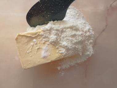 В миске разотрите сахарную пудру, ванилин и сливочное масло. Я сделала это деревянной ложкой, но вы можете использовать миксер с обычным венчиком. А можно сделать то же самое и в стационарном блендере. Но внимательно следите, чтобы масло не перегрелось, т.к. ножи блендера быстро нагреваются. Ванилин можно заменить на ванильный сахар. Как правильно это сделать, читайте в отдельной статье по ссылке после рецепта.