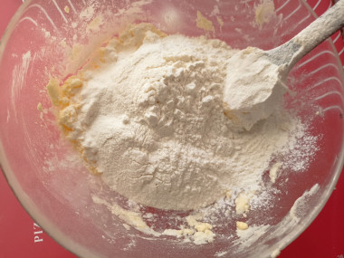 Всыпьте муку в миску с маслом небольшими порциями и замесите тесто. Муки может понадобиться чуть больше или чуть меньше указанного количества. Ориентируйтесь на консистенцию теста.