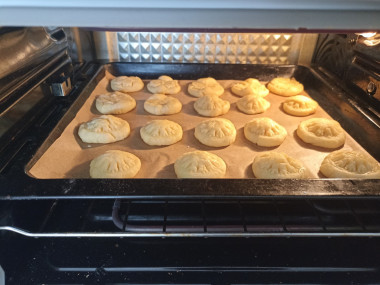 На противень, застеленный пергаментом, выдавила печенье. Печенье отправьте в духовку, разогретую до 180 градусов примерно на 10-12 минут. Точное время зависит от вашей духовки. У готового печенья должны зарумяниться края. Узнать об особенностях работы духовок, а также о различных видах пергамента можно, прочитав отдельные статьи, ссылки в конце рецепта.