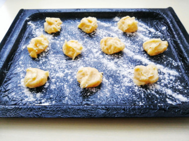Застелите противень бумагой для выпечки. Я всегда выбираю силиконизированный пергамент — к нему выпечка точно не прилипнет. Чайной ложкой, смоченной в воде, набирайте тесто и выкладывайте его комочками на противень. Размер можете сделать любой, у меня с грецкий орех, но учитывайте, что булочки вырастут при выпечке. Не забудьте также оставлять между ними расстояние. У меня получилось один полный противень и один поменьше.