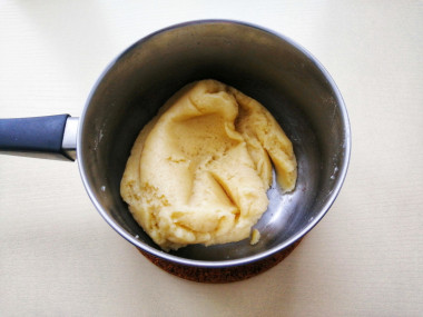 Процесс приготовления теста - несложный и довольно увлекательный. В небольшом ковшике с толстым дном соединила сливочное масло, соль и воду, поставила на средний огонь. Когда масло растаяло, а вода закипела, всыпала в ковшик всю муку, перемешала. После того, как тесто стало гладким и однородным, поставила его на подоконник остывать. Затем ввела в него три яйца по одному, вымешивая тесто каждый раз до гладкости. Тесто, при введении яиц, у меня тоже сначала распадалось на комочки, а потом становилось однородным.