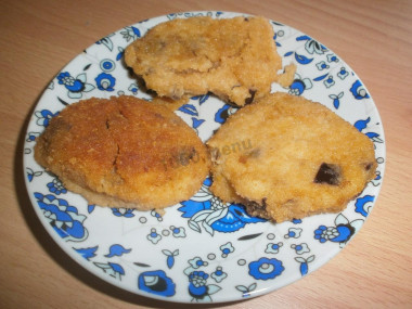 Далее займитесь непосредственно котлетами. Из данного количества продуктов получится 4 котлетки, учитывайте это при приготовлении, при необходимости возьмите продуктов больше. Молоко подойдет любой жирности, можете разбавить его водой. Обваливать котлеты перед жаркой можно как в сухарях, так и в муке. А вот жарить лучше не на чистом сливочном масле, а на смеси его с растительным. Изюм можете не добавлять.