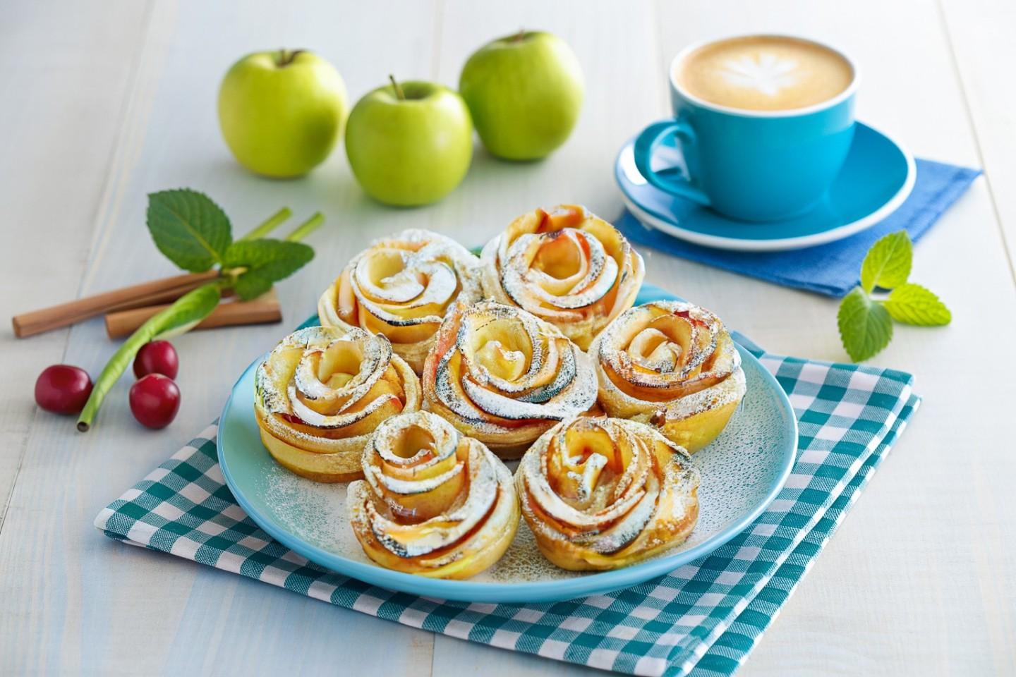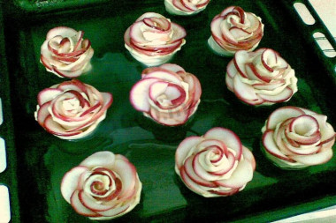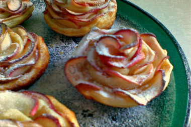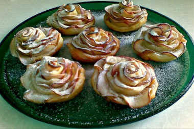 Оставшееся тесто внизу подогнуть под розочку. Тесто по бокам розочек смазать взбитым яичный желтком. Изделия поставить на смазанный маслом противень и выпекать в разогретой до 150 гр. духовке в течение 20-25 минут. Готовые розочки посыпать сахарной пудрой. Приятного аппетита!