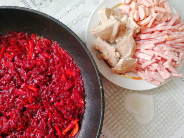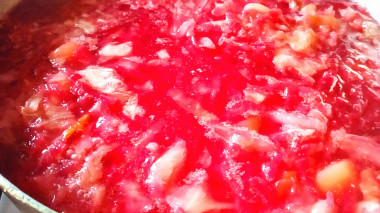 Пока готовился бульон, нашинковала и обжарила на растительном масле 150 г капусты. По рецепту этого не требовалось, но моя капуста настолько жесткая, что требует тепловой обработки. Потом отдельно обжарила маленькую луковицу и половину морковки, добавила натёртую свеклу (у меня была замороженная), по одной столовой ложке томатной пасты, сахара и уксуса. Тушила до мягкости овощей.