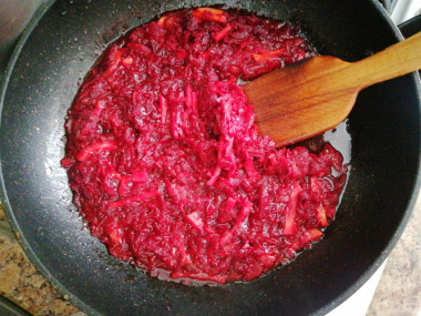 В сковороде на среднем огне разогрейте сливочное масло. Добавьте лук, морковь и свеклу, влейте немного воды или бульона из кастрюли. Тушите овощи около 10 минут до мягкости. В конце зажарку посолите, поперчите. О том, как подобрать идеальную сковороду, а также как правильно выбрать масло, читайте в отдельных статьях, ссылки в конце рецепта.