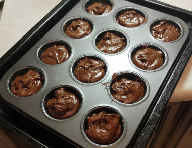 Выложите тесто по формам для кексов или по небольшим порционным керамическим формочкам. Формочки перед выпечкой лучше смажьте маслом, даже силиконовые хорошего качества лучше смазать. Я этот этап решила пропустить, так как была уверена в качестве формочек, но пирожные получаются с очень нежной корочкой, которая легко пристает к поверхности формы и достать такие пирожные целыми и невредимыми очень сложно (у меня они немного пострадали)!