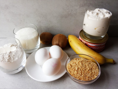 Как сделать бисквитный торт с киви и бананом? Подготовьте ингредиенты для бисквита. Если планируете печь небольшой тортик, уменьшите продукты в 2 раза, для удобства воспользуйтесь калькулятором. Поставьте духовку на разогрев до 180 градусов.