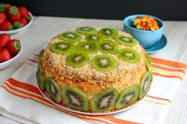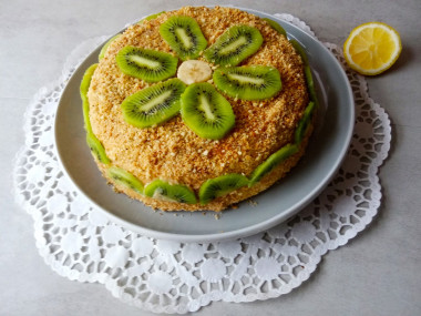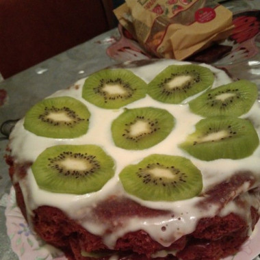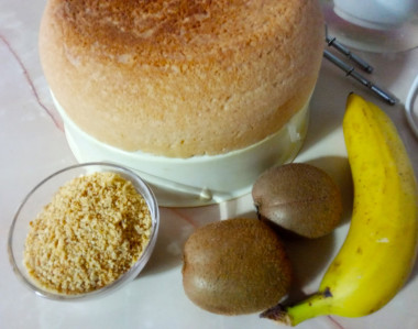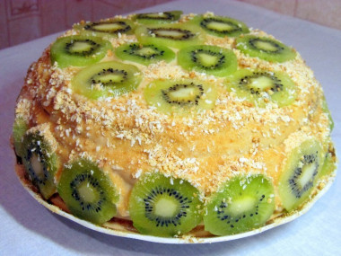 К чаю решила испечь бисквитный торт с киви и бананом. Готовила половину порции, поэтому количество ингредиентов уменьшила с помощью калькулятора сайта. Бисквит выпекала в мультиварке, мне так проще и удобнее. Готовый бисквит после остывания разрезала на два коржа. Нижний корж щедро промазала кремом, выложила на него ломтики банана и киви, накрыла вторым коржом, который тоже снизу промазала кремом. Затем оставшимся кремом смазала весь торт, посыпала его крошкой из печенья ( кокосовой стружки дома не оказалось), украсила дольками киви. Тортик - замечательный! Чаепитие удалось на славу! Спасибо за рецепт, nasstin!