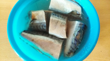 Рыбу надо предварительно слегка разморозить. Не полностью размороженная скумбрия нарезается более красивыми, ровными кусочками. Внутренности также легче удаляются вместе с черной плёнкой, которая придает рыбе горечь. Нарезаем рыбу кусочками по 1,5-2 см., не вспарывая брюшко. Тщательно удаляем все внутренности и плёнку из каждого кусочка. Если разделываете размороженную рыбу, промойте каждый кусочек под проточной водой, очистив от крови.