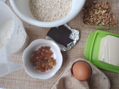 Орехи у меня были грецкие, клюкву заменила изюмом, а шоколад взяла горький, как и рекомендовалось. Дала тесту полежать, сформировала их него печеньки и поставила выпекаться. Аромат стоял волшебный! Печенье хорошо поднялось, при этом внутри оно осталось мягким. Теперь это мое любимое овсяное печенье! Рецепт - супер!