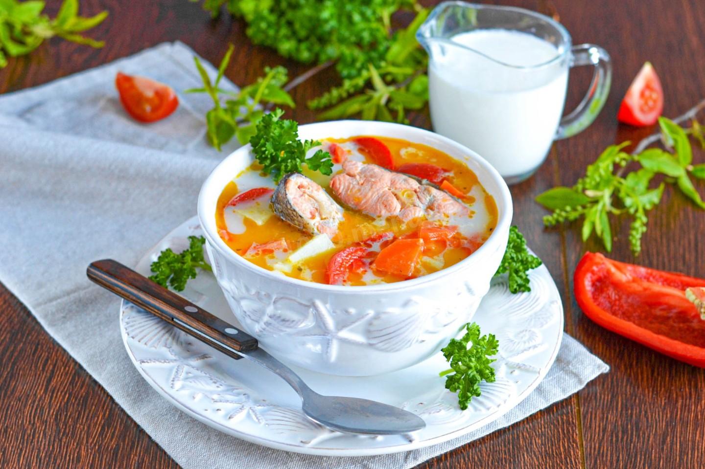 Подготовьте все необходимые ингредиенты. Бульон можете использовать рыбный или овощной. Если нет бульона, замените его обычной водой. Вместо сливок можно взять молоко. Болгарский перец можно совсем не добавлять и обойтись стандартным для ухи набором овощей: картошка, морковь и лук.