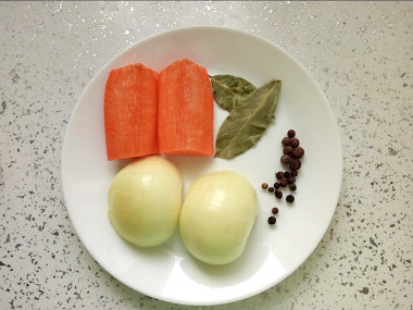 Через 2 часа добавляем лук, соль, лавровый лист, черный и душистый перец горошком