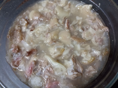 Мне хотелось, чтобы в этом блюде было побольше мяса, поэтому добавила небольшую рульку. Все это оставила вымачиваться в холодной воде на ночь.
