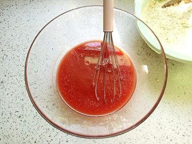 Затем добавьте томатный сок и растительное масло. Быстро перемешайте лопаткой.