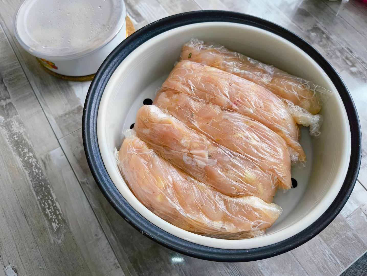Возьмите куриные грудки , слегка разморозьте их — так мясо будет легче нарезать; снимите кожу, оттянув край вверх и потянув в противоположную сторону, при необходимости подрежьте плёнку ножом; срежьте мясо с кости — должно получиться около 1 кг чистого филе из указанного количества ингредиентов.
