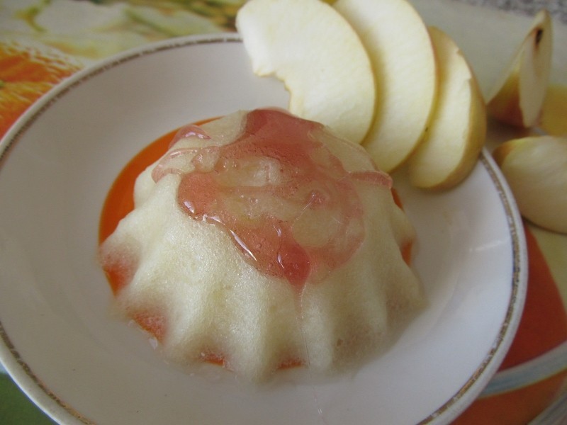 Яблоко у меня было весом около 150 граммов. Запекала его в духовке в фольге. Запеченное яблоко вместе с кожурой превратила в пюре с помощью погружного блендера. Вместо желатина я использовала два грамма агар-агара с силой геля 900 г/см². Предварительно замочила агар-агар в небольшом количестве воды, потом довела его в микроволновке до 85 градусов. Все остальные действия я сделала в соответствие с рекомендациями в рецепте. Получившуюся массу разложила по двум стаканчикам. Застывать самбук я оставила при комнатной температуре.