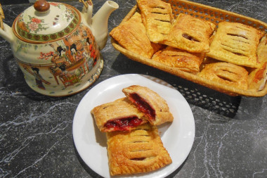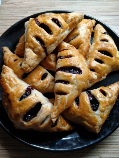 Люблю выпечку из слоёного теста и люблю вишню. Решила совместить два вкусных ингредиента и когда увидела замечательный рецепт,сразу приготовила слойки с вишней из слоёного теста.
