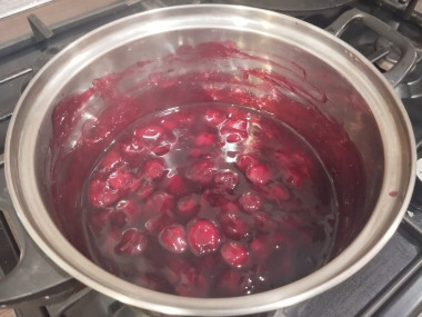 Вишня у меня была замороженная без косточек, которую я проварила с сахаром и с добавлением крахмала кукурузного,разведённого в воде.