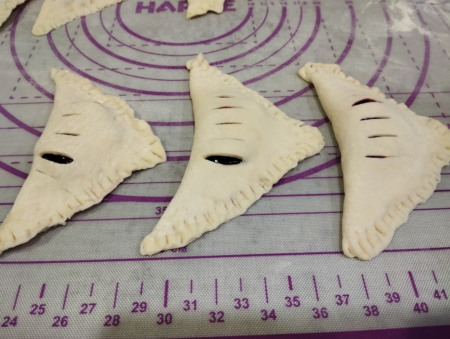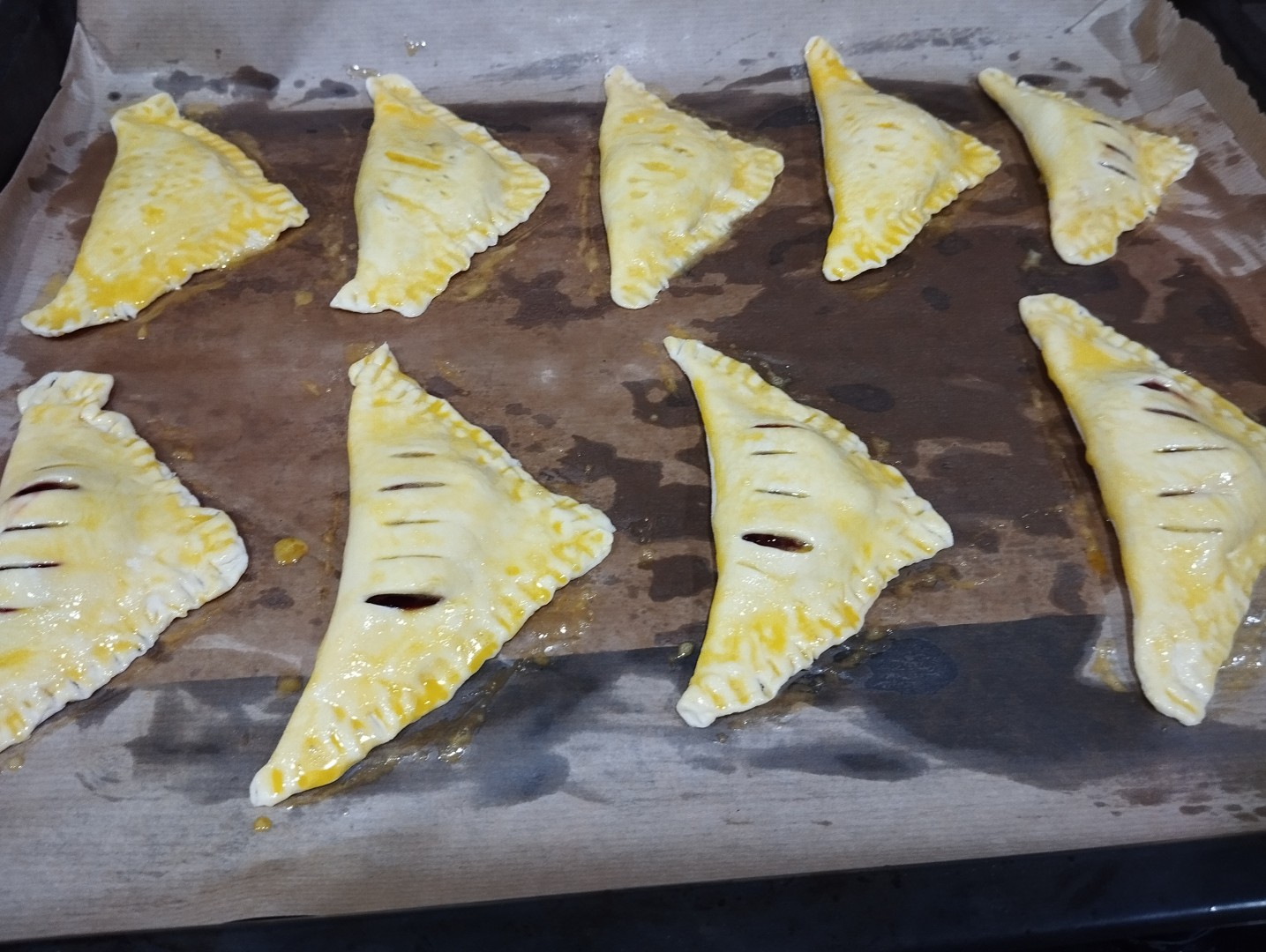 Накройте начинку надрезанной стороной теста и хорошо защипните края слойки. Получатся вот такие треугольники. Выложите слойки на сбрызнутый водой противень (или покрытый пекарской бумагой, силиконовым ковриком для выпечки). Сверху смажьте желтком, немного не доходя до края изделия, для красивого румянца.