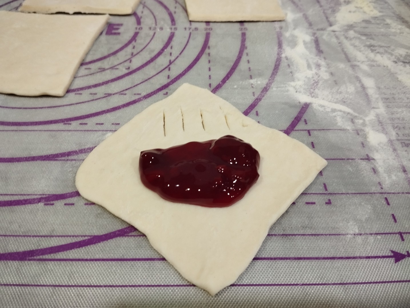 Раскатайте тесто в пласт толщиной 3-4 мм и нарежьте на несколько квадратов одинакового размера. Каждый квадрат условно поделите по диагонали на две половинки. На одной половинке сделайте аккуратные надрезы обычным ножом или ножом для пиццы, не доходя до края и центра квадрата около 8 мм. Выложите на не надрезанную часть каждого квадрата одну столовую ложку вишнёвой начинки. Края каждого квадрата слегка смажьте водой, чтобы тесто лучше склеилось.