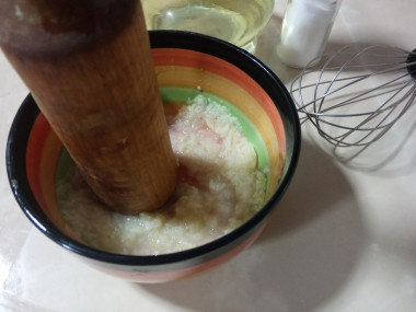 Вместо ступки я взяла удобную пиалу. К измельченному чесноку всыпьте соль и перетрите все вместе до состояния кашицы. Вот сейчас пригодится пестик. Далее влейте к чесночной массе ложку лимонного сока. И снова перетрите все пестиком.