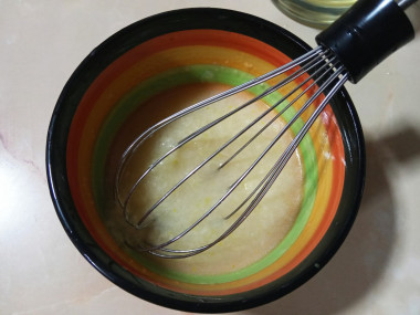 Следующий этап лучше делать при помощи небольшого венчика. Начните вливать по ложке масла к чесноку. Очень тщательно перемешайте массу венчиком, добиваясь полного смешивания продуктов. На чесноке не должно будет остаться масляной пленки. Когда это произойдет, влейте следующую ложку и снова вмешайте ее венчиком.