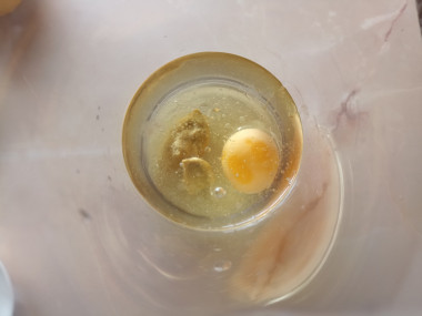 Яйцо как следует помойте с моющим средством, обсушите салфеткой. Разбейте его в отдельную пиалку. Постарайтесь сохранить целым желток, это важно.