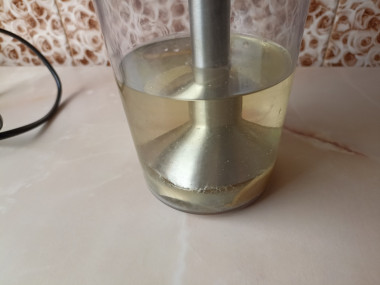 Возьмите высокий стакан от блендера. Обратите внимание на порядок закладки продуктов, это тоже имеет значение. Первым влейте в него растительное масло.