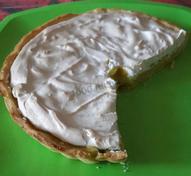 Сверху кладём меренгу, распределяя её по всей поверхности тарта. Ставим на верхнюю полку духовки или под гриль на 4 минуты, чтобы меренга зарумянилась слегка.